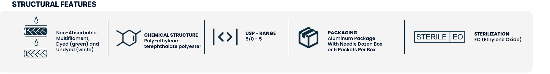 • Sterile synthetic non-absorbable suture composed of poly-ethylene terephthalate polyester