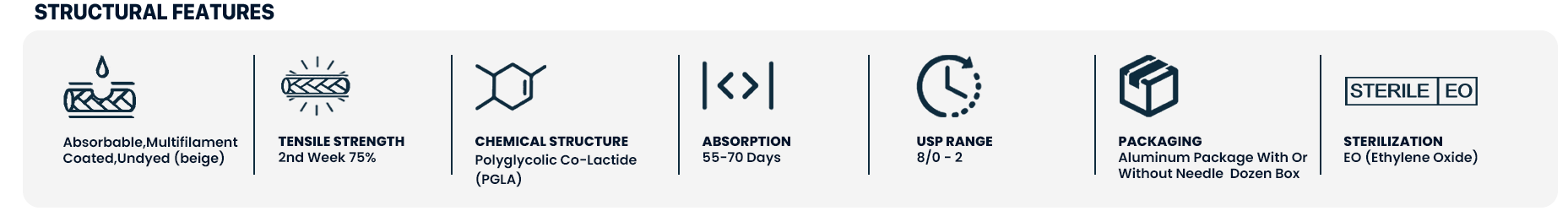 • Braided multifilament, coated with equal combination of copolymer (glycolic acid and lactic acid) and calcium stearate