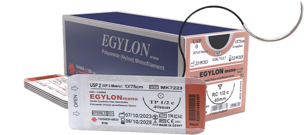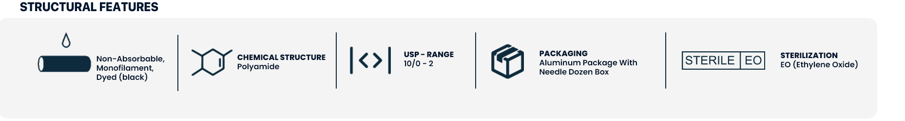 • Sterile synthetic non-absorbable suture composed of polyamide (Nylon) obtained by polymerization of long chain aliphatic polymers nylon 6 & 6.6