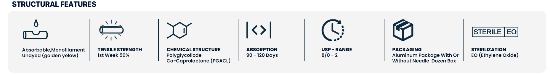 • A sterile synthetic absorbable surgical suture obtained by linear polymerization of 75% glycolic acid and 25% caprolactone (poliglecaprone)